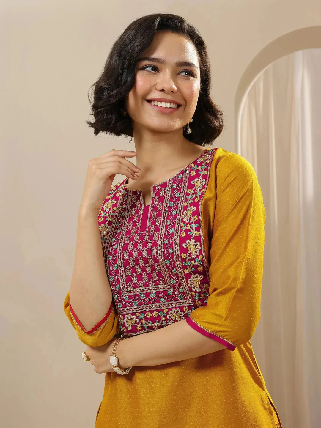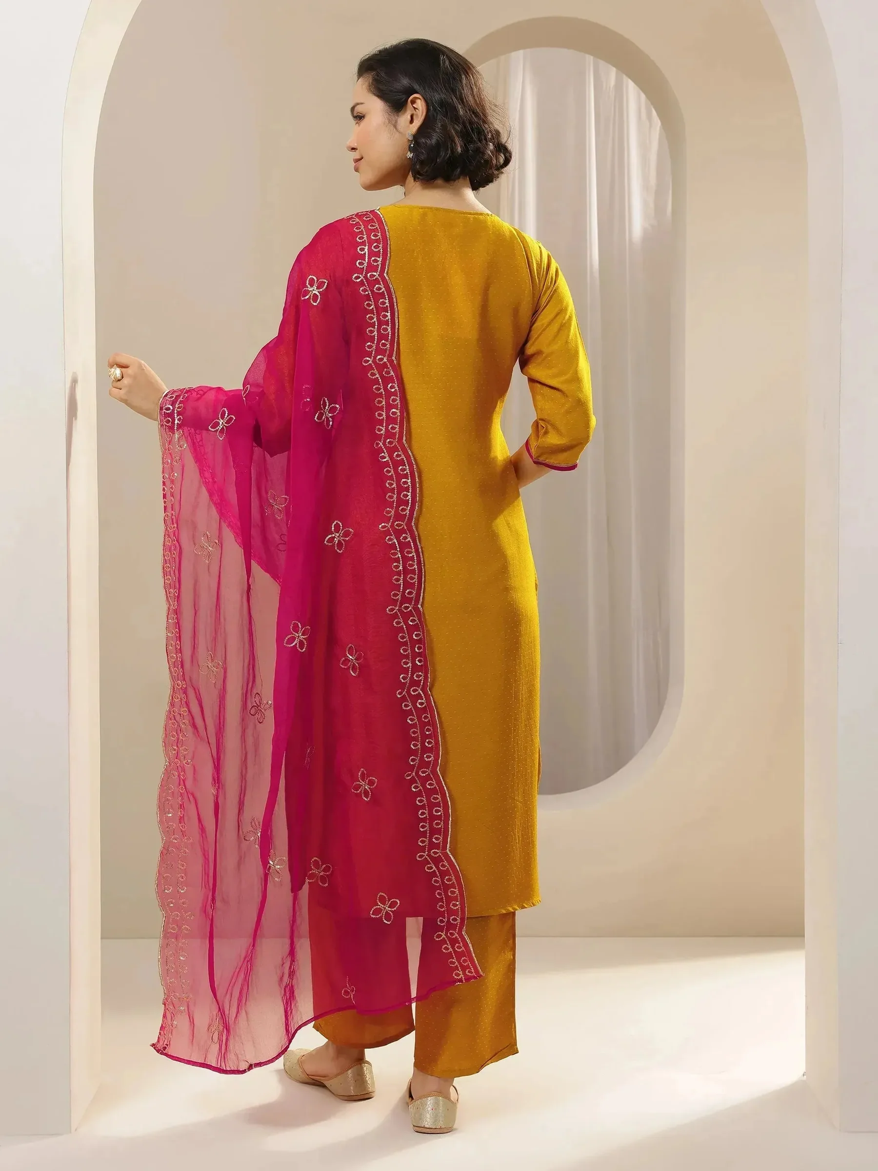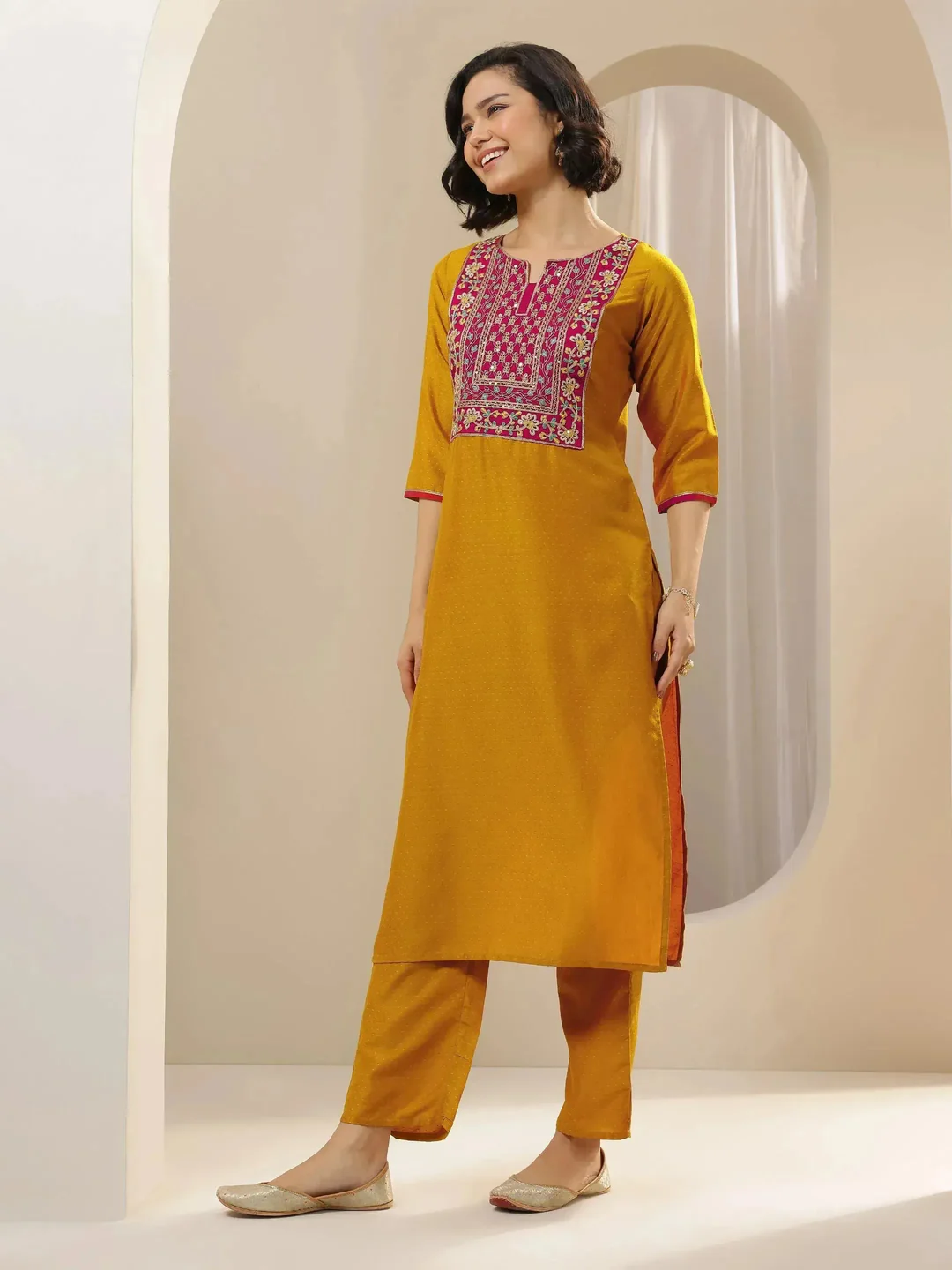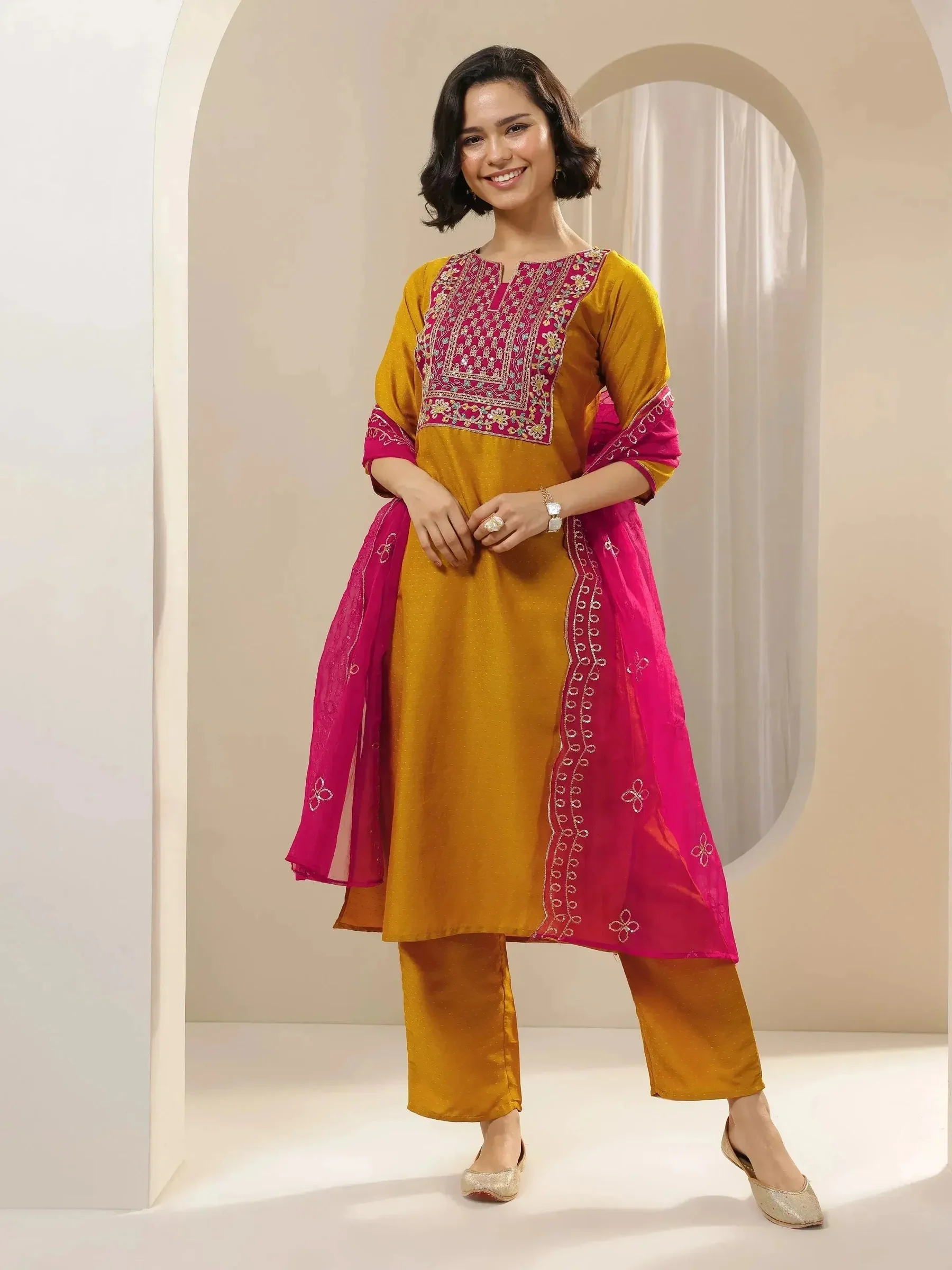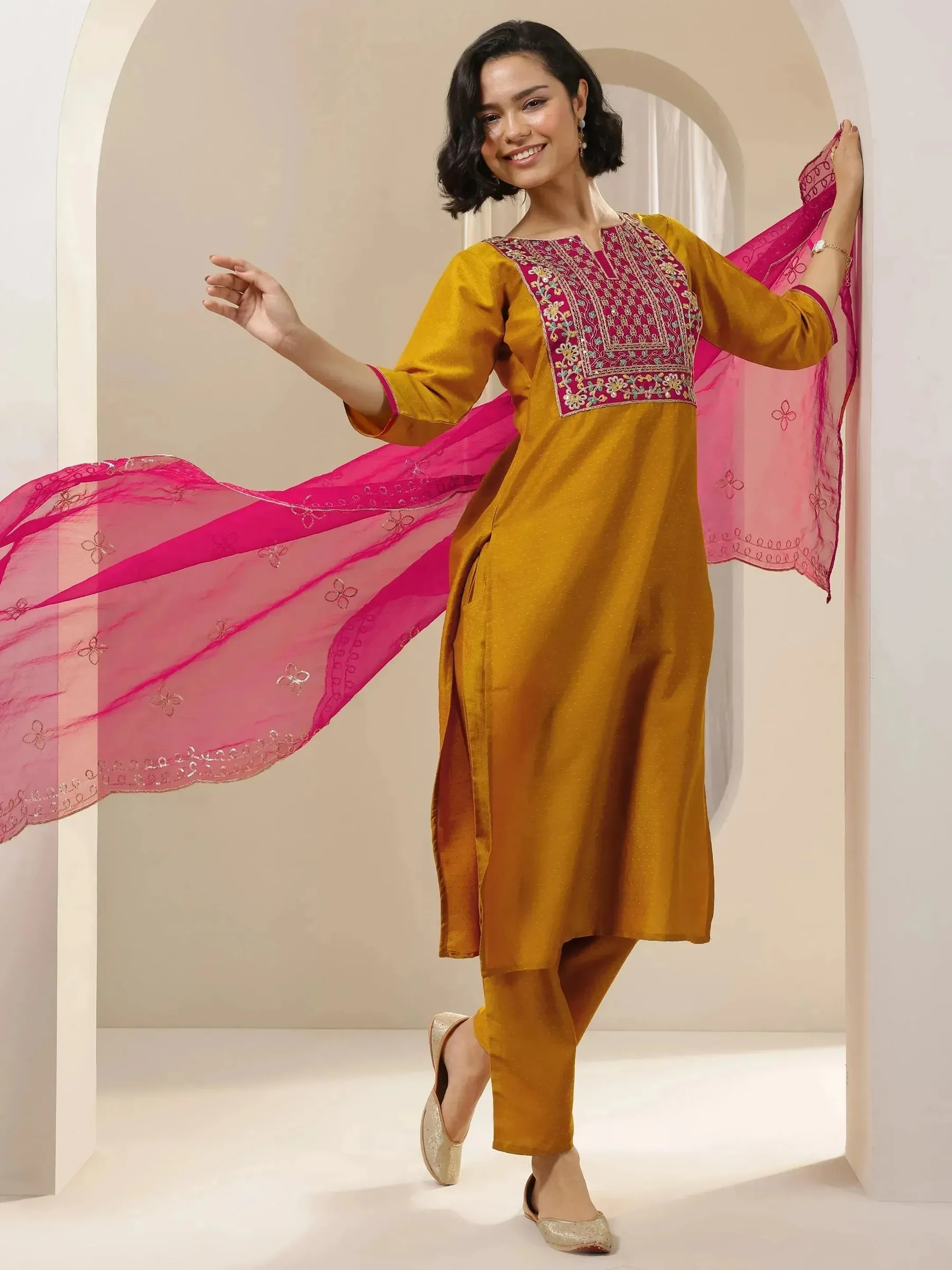 A mustard embroidered silk blend straight suit set with a dupatta sounds like an elegant and traditional outfit, perfect for various occasions such as weddings, festivals, or formal gatherings. Here’s a breakdown of the key elements in this suit set: