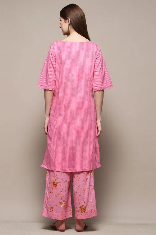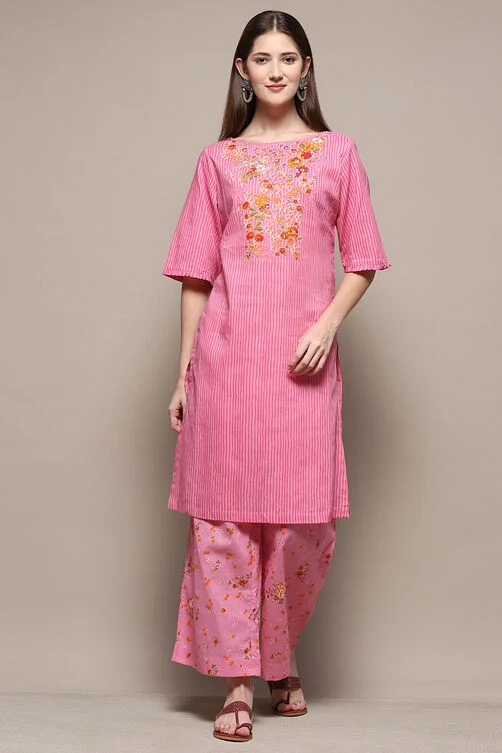 A Pink Cotton Straight Kurta Palazzo Suit Set sounds like a beautiful and comfortable outfit! Here’s a description of what it might typically look like: